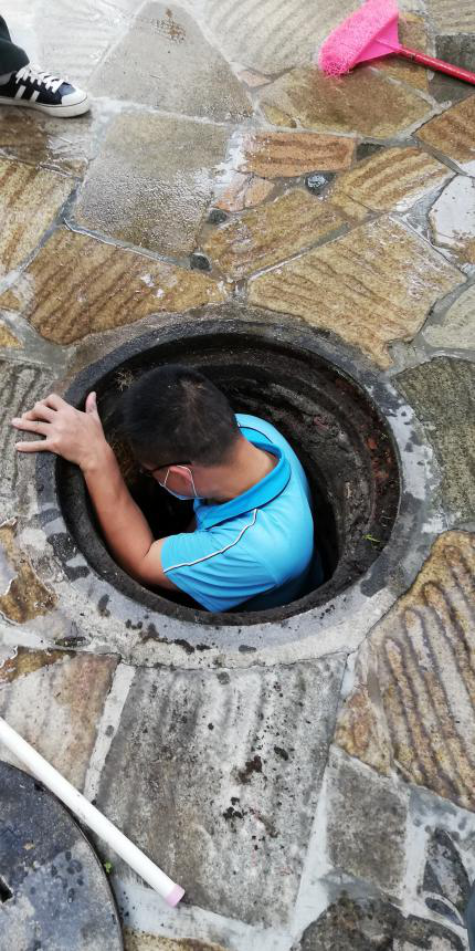 2020年2月24日,溫泉池區(qū)有一條排水溝堵塞,剛好工程部崔部長經(jīng)過,了解情況后,他二話不說,馬上打開排污井蓋爬到里面檢查。經(jīng)檢查,原來是樹根堵塞污水管,他便徒手把外面的樹根處理了,擔(dān)心還有樹根已經(jīng)深入到水管內(nèi)部,還找來工具把水管內(nèi)的樹根清理出來。