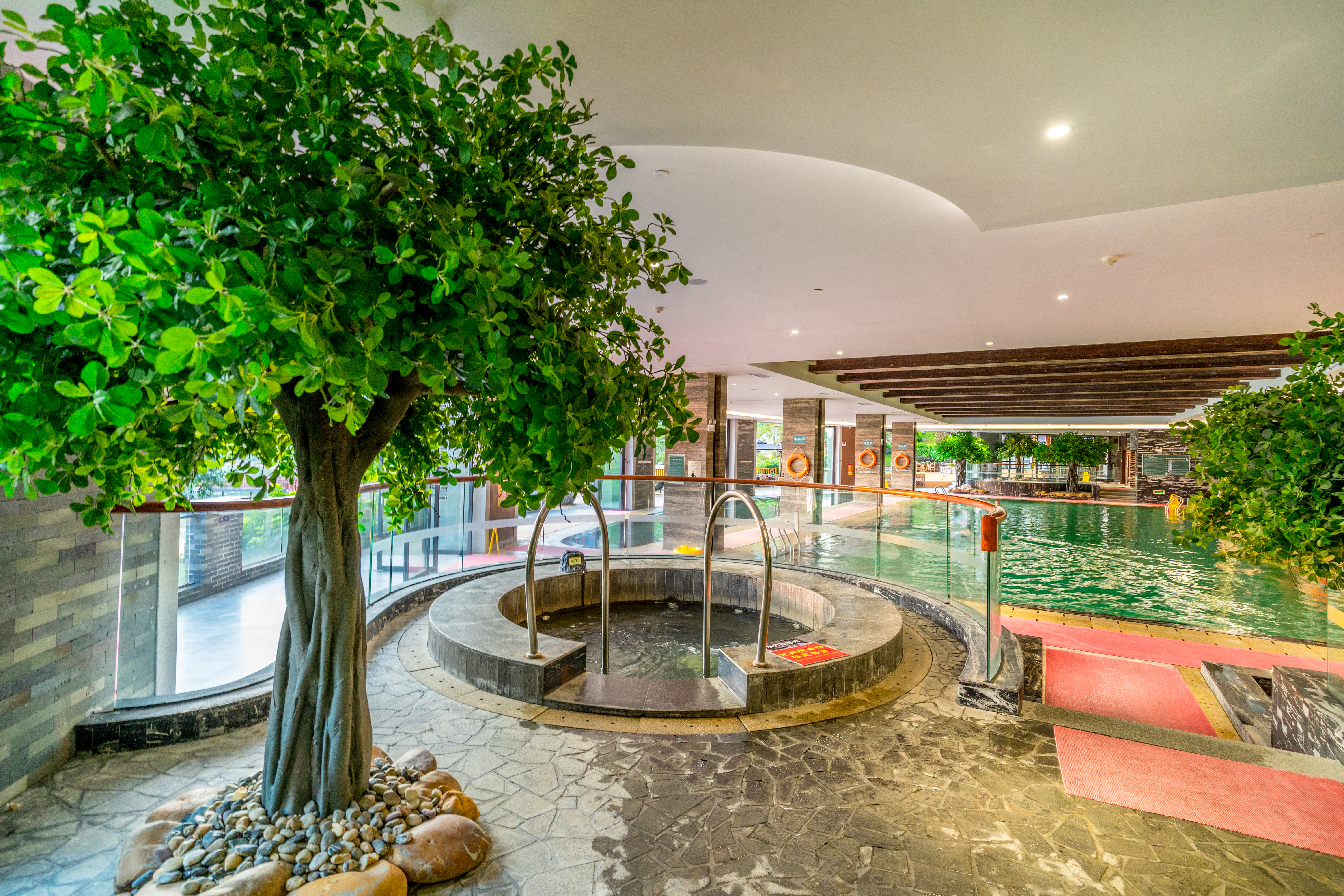 云泉谷包含:無邊際湖景湯泉、特色花池、水療池、游泳池、室外熱石床、按摩池、室內恒溫泉水泳池、干蒸房、茶湯泉、艾草池等,讓您融入“山、水、茶、林”的云泉谷感受不一樣的養生“盛宴”。