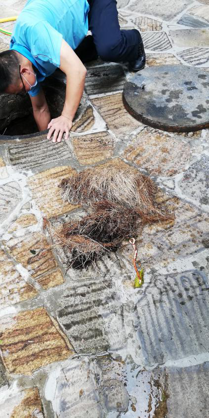 2020年2月24日,溫泉池區(qū)有一條排水溝堵塞,剛好工程部崔部長經(jīng)過,了解情況后,他二話不說,馬上打開排污井蓋爬到里面檢查。經(jīng)檢查,原來是樹根堵塞污水管,他便徒手把外面的樹根處理了,擔(dān)心還有樹根已經(jīng)深入到水管內(nèi)部,還找來工具把水管內(nèi)的樹根清理出來。