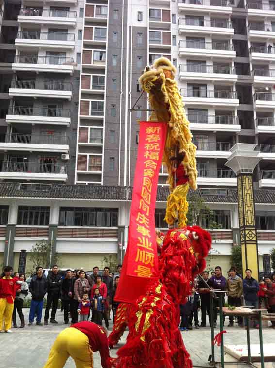 在歡快的鑼鼓聲中,一頭金獅尾隨著兩頭紅獅威風凜凜的出場。紅獅輕輕踱步,另一頭的紅獅輕輕地跳上矮樁,擺著優美的身姿。最引人注目的是那頭全身珠片金光閃閃上高桿的金獅。金獅輕輕一躍就躍上了高樁。一會兒躍起,一會兒下探,活靈活現。突然,鼓聲大振,獅子們更加精神抖數,金獅一躍而起,把青菜一口“吃”掉,再咬碎吐出,拋向觀眾,接著拉出“合家團圓同慶事業順景”的新春橫幅送給大家。頓時,觀眾響起了熱烈的歡呼和掌聲。