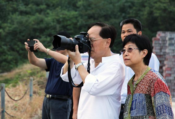 當天,曾蔭權在夫人的陪同下,一身休閑裝,攜帶自己心愛的專業攝影器材來到飛天蠶生態茶園。漫步在風光無限的茶園內,曾蔭權被景區的山山水水、奇花異草、自然生態深深吸引,頻頻駐足端起相機將眼中的美景收藏。在與象窩茶樹的近距離接觸時,聽說象窩茶葉種植從不使用化肥,決不噴灑農藥,嚴格實施生態種植,曾蔭權還情不自禁地采下一片茶芽品嘗。