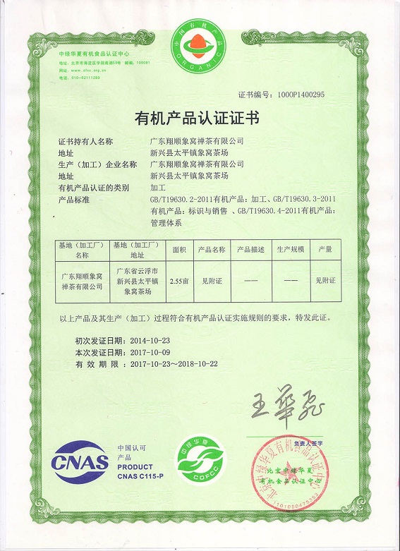 10月16日,翔順象窩禪茶公司收到中綠華夏有機食品認證中心發來的有機茶認證證書,翔順象窩禪茶成為新興縣目前首家榮獲該認證的茶品牌,標志著象窩禪茶有機品質再次獲得權威機構的認可,在品牌建設與推廣上,邁出了更堅實步伐。