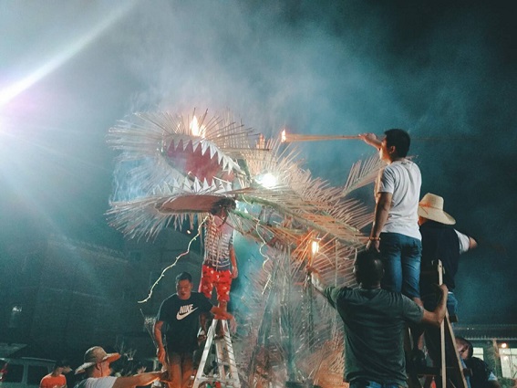 火龍扎作方法十分講究,最復雜的工序在于龍的前半身。一開始,要把毛竹削成一條條的竹篾,然后從橫豎兩個方向一圈一圈地圍繞成形,連接的部分用小鋼絲擰緊。龍骨架用竹篾扎成一條龍的樣子,然后將稻草搓成繩,纏繞在竹篾上,最后龍頭龍身均插滿長壽香,屆時再由村民點燃香火。除了制作火龍,還有用竹篾扎成各式各樣的“吉祥物”—鯉魚、公雞、白鶴、漁船、星星、蝦、蟹、火球等。