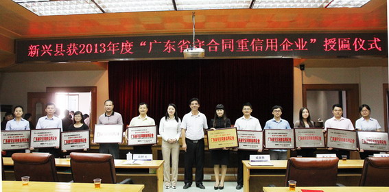 10月15日,新興縣獲2013年“廣東省守合同重信用”的授牌儀式在縣工商局七樓會議室舉行。縣46家企業接受表彰,翔順集團及十家下屬公司獲得該稱號(下圖為翔順十一家公司合影),其中翔順集團連續13年被授予該稱號。