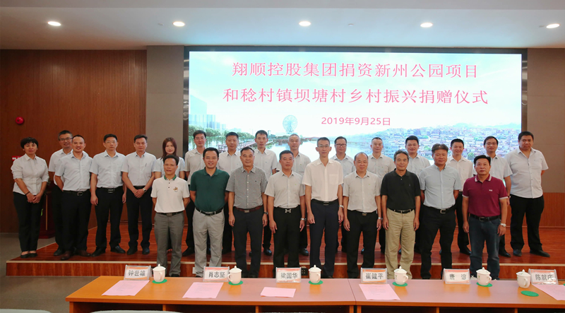 本報訊 為助力新興縣鄉村振興和城市擴容提質工作,積極發揮本土企業熱能,9月25日上午,翔順控股集團捐資新州公園項目和稔村鎮壩塘村鄉村振興捐贈儀式于翔順集團辦公樓演播廳順利舉行,儀式上翔順控股集團捐資5000萬元助力新州公園項目建設,以及捐資1500萬元推進壩塘鄉村振興工程建設。唐誼、陳就慶、梁國華、肖志堅、徐廣志、潘耀才、蘇榕華等縣領導、新興縣相關單位負責人以及相關鎮村單位班子成員,翔順控股集團董事長崔健平,總裁陳彬,集團管理層及職工代表逾 200人參與本次儀式。