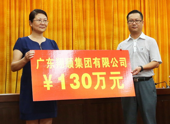 6月30日,在第六個廣東省“扶貧濟(jì)困日”新興縣捐款活動現(xiàn)場,集團(tuán)副總裁鐘世雄(右)代表集團(tuán)捐資130萬元。