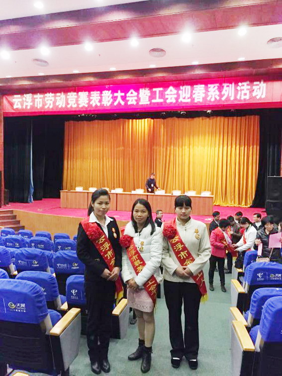 2016年1月12日,云浮市勞動競賽表彰大會暨工會迎春系列活動落下帷幕。會議對2015年度云浮市職工技能競賽獲獎人員及2015年度云浮市“最美基層工會干部”進行表彰,并命名其為“金牌工人”。