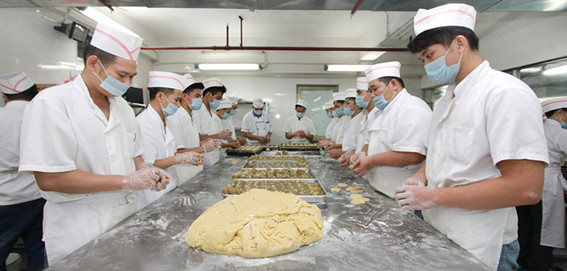 走進工場,只見十幾名師傅們正手腳麻利地趕工,忙得不亦樂乎。記者看到,師傅們清一色地穿戴制服,帽子、口罩、手套一樣不少,可謂全副武裝,專業(yè)性一覽無遺。李志寬副總經(jīng)理表示,師傅們不僅要穿著統(tǒng)一,每一名員工做什么工作都有明確分工、責任到人。制作餡皮的、成型的、烘焙的、包裝的,每一名員工都認真細致地做好自己的本職工作,整個流水線有條不紊。