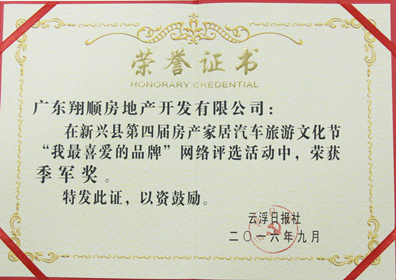 近日,在新興縣第四屆房博會“我最喜愛的品牌”網絡評選活動中,翔順房地產公司再次贏得廣大市民的青睞,奪取該項評選活動的季軍。